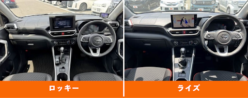 最後は内装です。基本構造は同じですが、細かい質感や色使いに違いがあり、ライズはカジュアル寄り、ロッキーはやや上質感を意識した仕様で選べることが多いです。